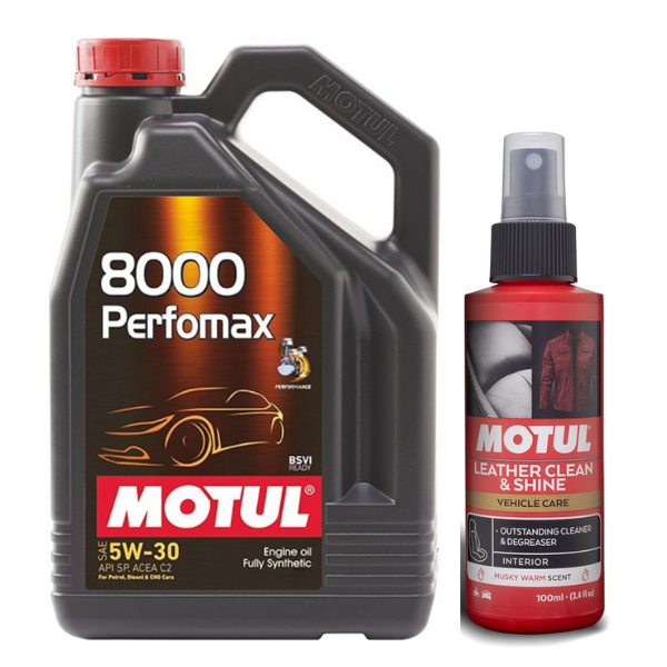 The ideal duo for efficient car maintenance. This combo features a 3L bottle of PERFOMAX 5W30 full synthetic engine oil, perfect for many popular vehicles, paired with Motul Leather Clean & Shine to revitalize your interior. Complete performance and care in one package.