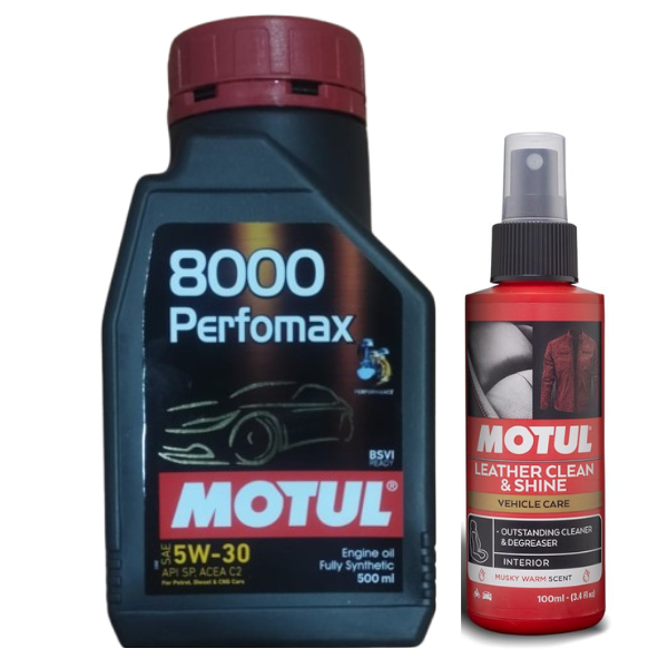 Your essential top-up and interior refresh kit. This handy combo includes a 500ML bottle of PERFOMAX 5W30 full synthetic engine oil to maintain optimal levels and a 100ml Motul Leather Clean & Shine to keep your cabin looking like new. Smart, convenient care for your car.