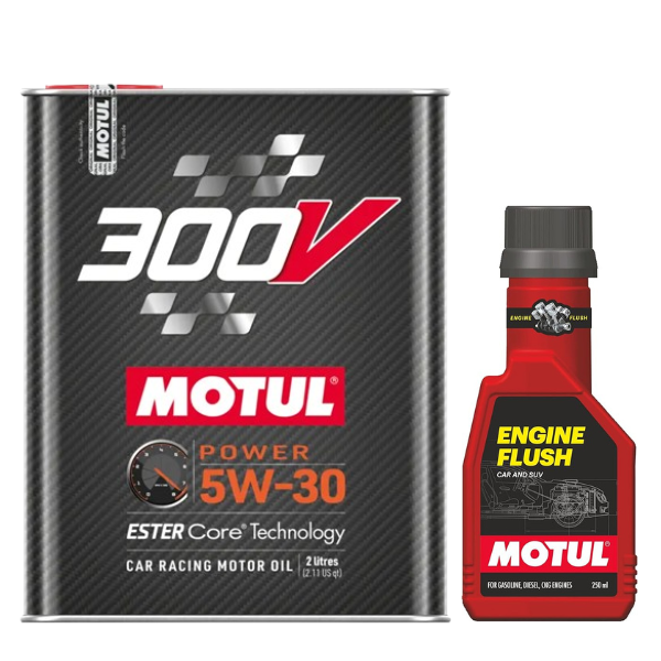 The ultimate high-performance package for racing and tuned engines. This combo pairs Motul's legendary 300V Power 5W30 double ester, competition-grade synthetic oil with a powerful Engine Flush to ensure a perfectly clean engine before the oil change. Maximize power output and protection.
