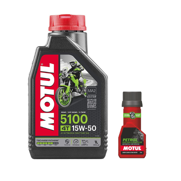 Motul 5100 4T 15W-50 API SM Technosynthese Synthetic Engine Oil for Bikes 1L And Petrol System Clean 50ml Combo